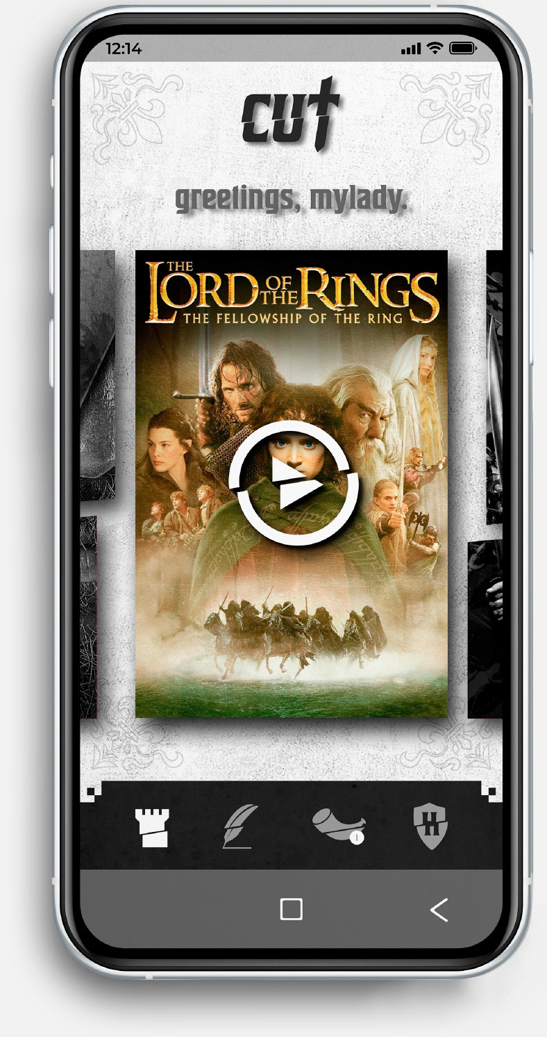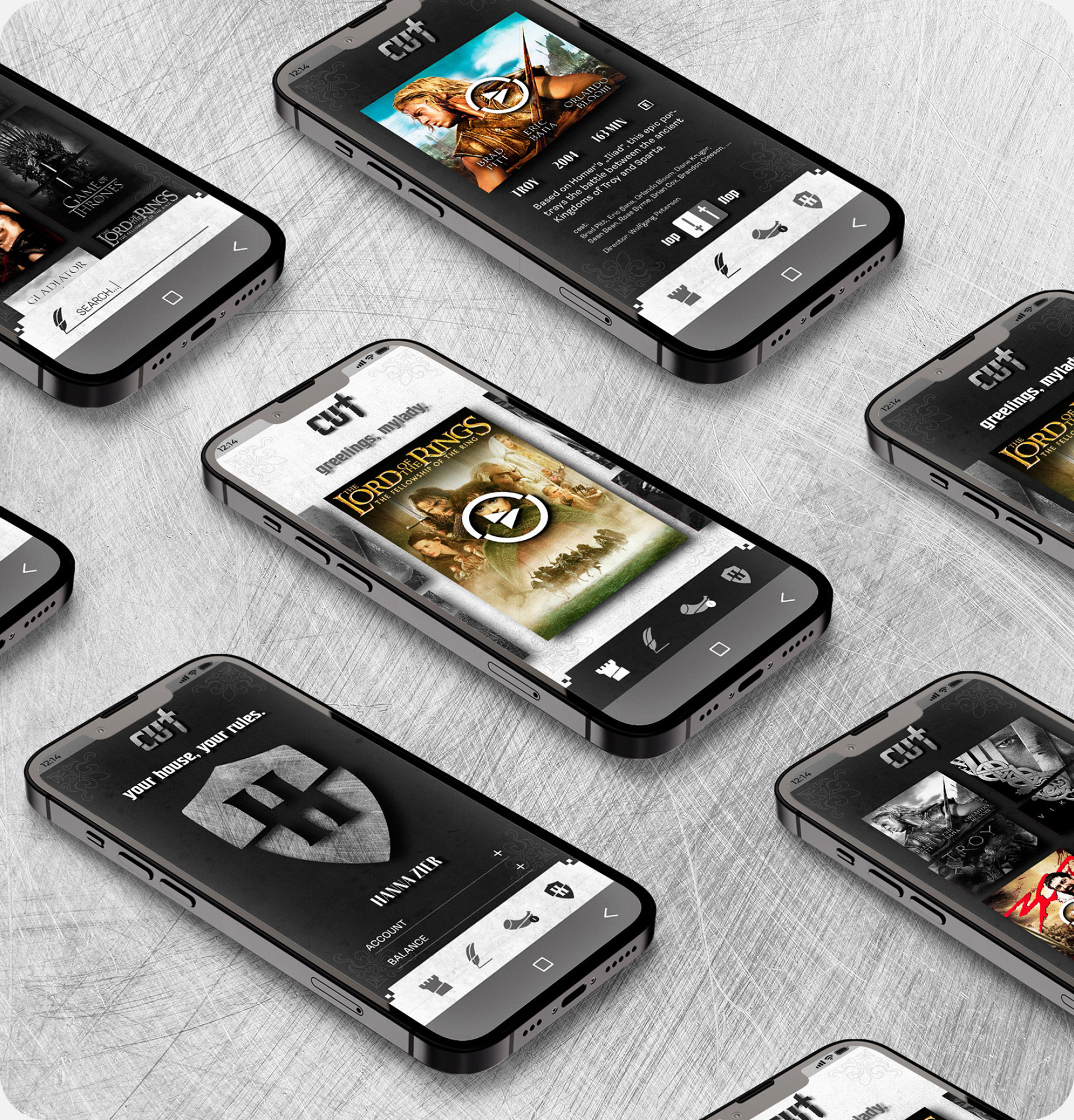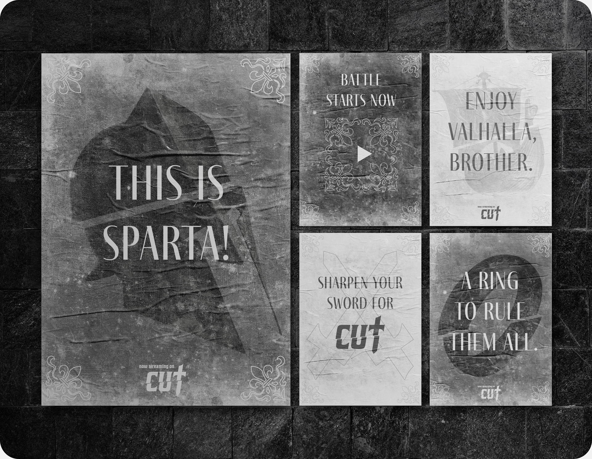 „Cut - movie k(nights) with epic fights“ is a fictional streaming service focusing on fantasy/warrior films and series. As for the branding, design elements include the literal element of the cut applied to the logo, icons and images, as well as the use of ornaments and rough textures. In addition to the web and app appearance, a preroll, digital advertising banners, posters, a social media presence and a welcome kit for new users were created.