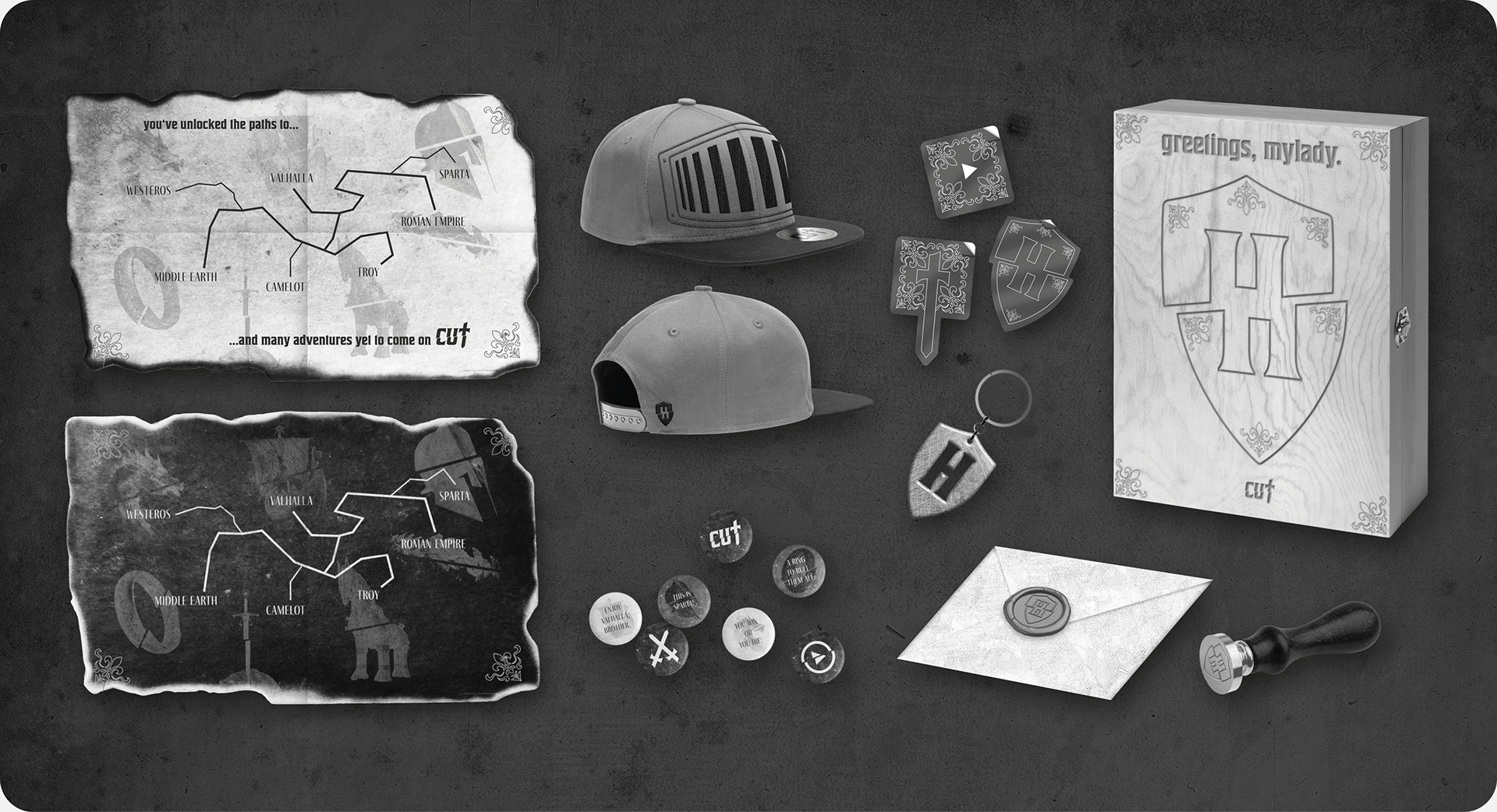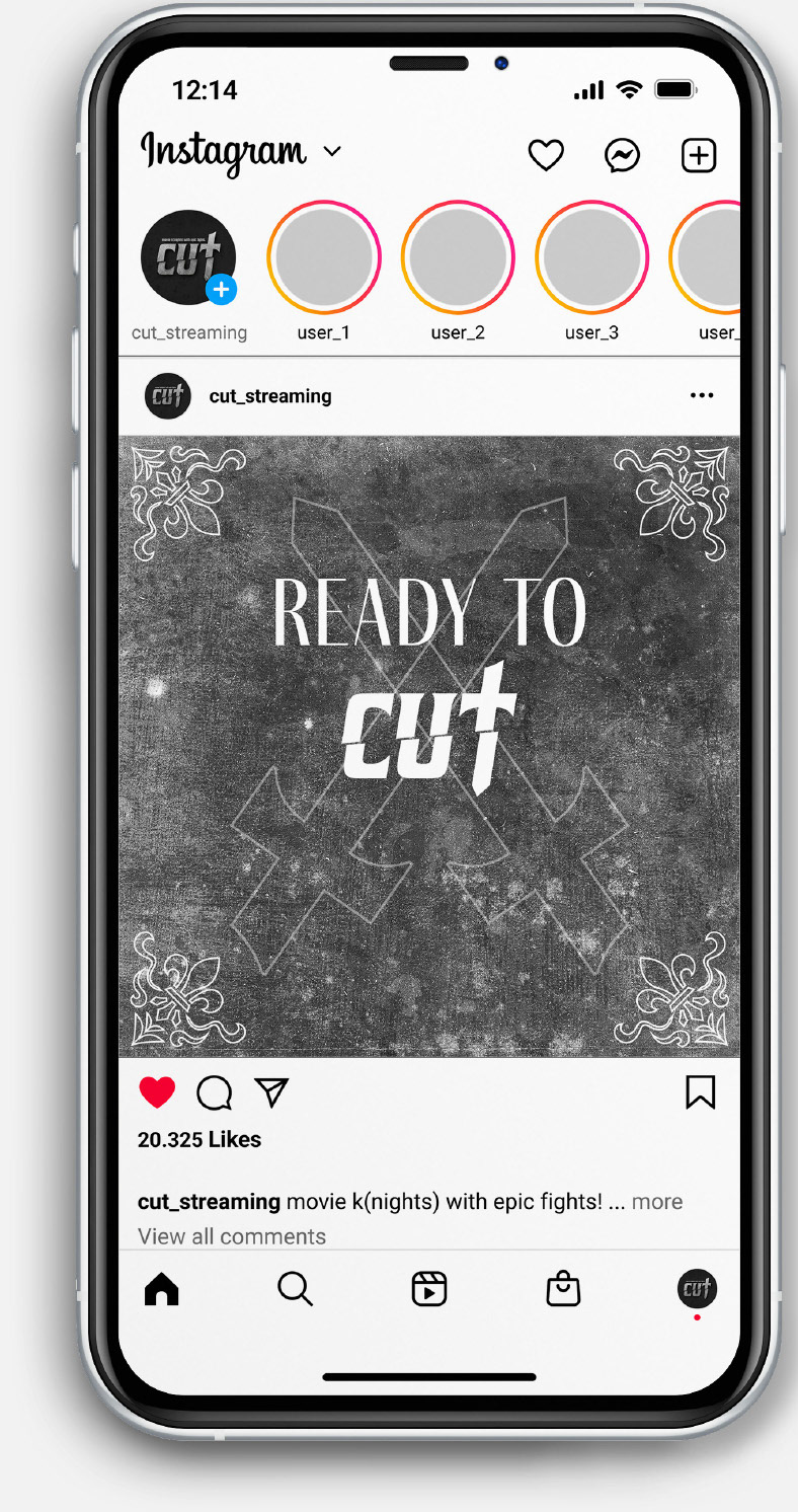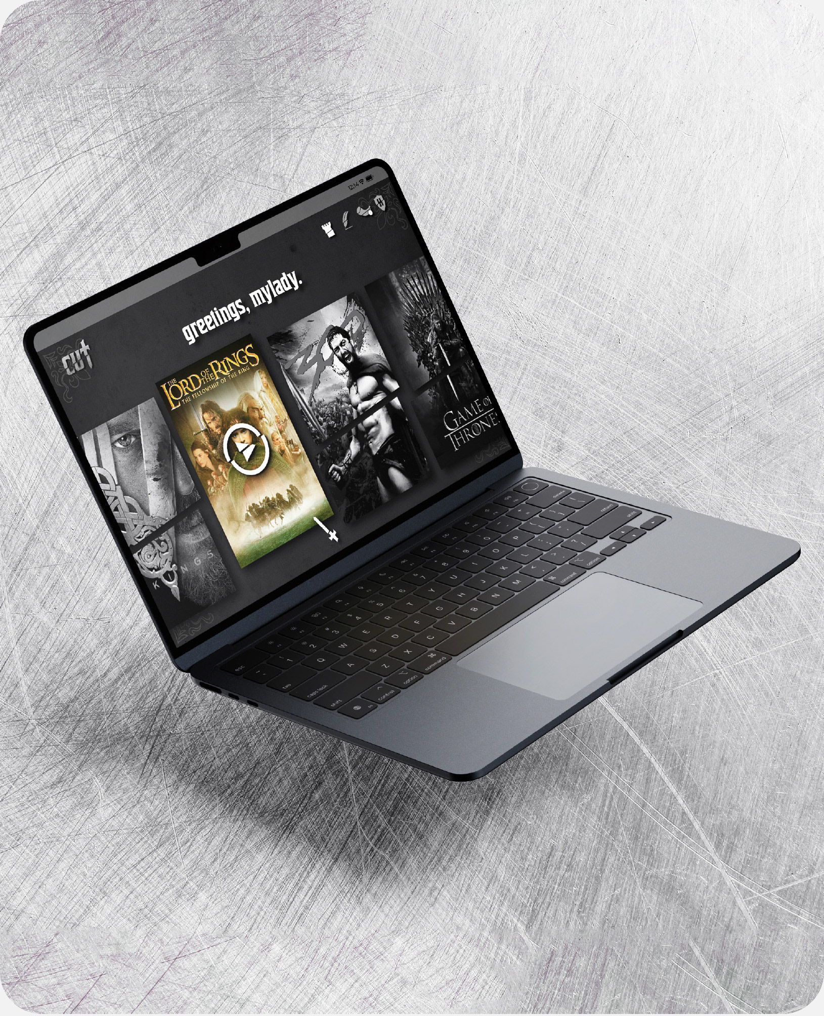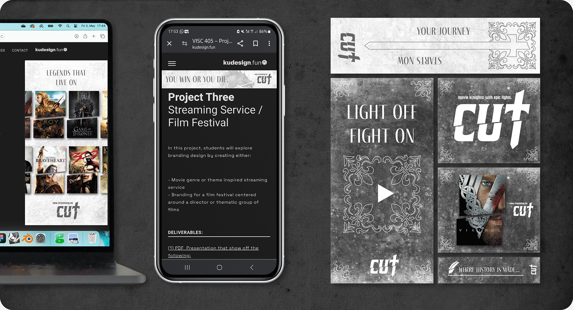 „Cut - movie k(nights) with epic fights“ is a fictional streaming service focusing on fantasy/warrior films and series. As for the branding, design elements include the literal element of the cut applied to the logo, icons and images, as well as the use of ornaments and rough textures. In addition to the web and app appearance, a preroll, digital advertising banners, posters, a social media presence and a welcome kit for new users were created.
