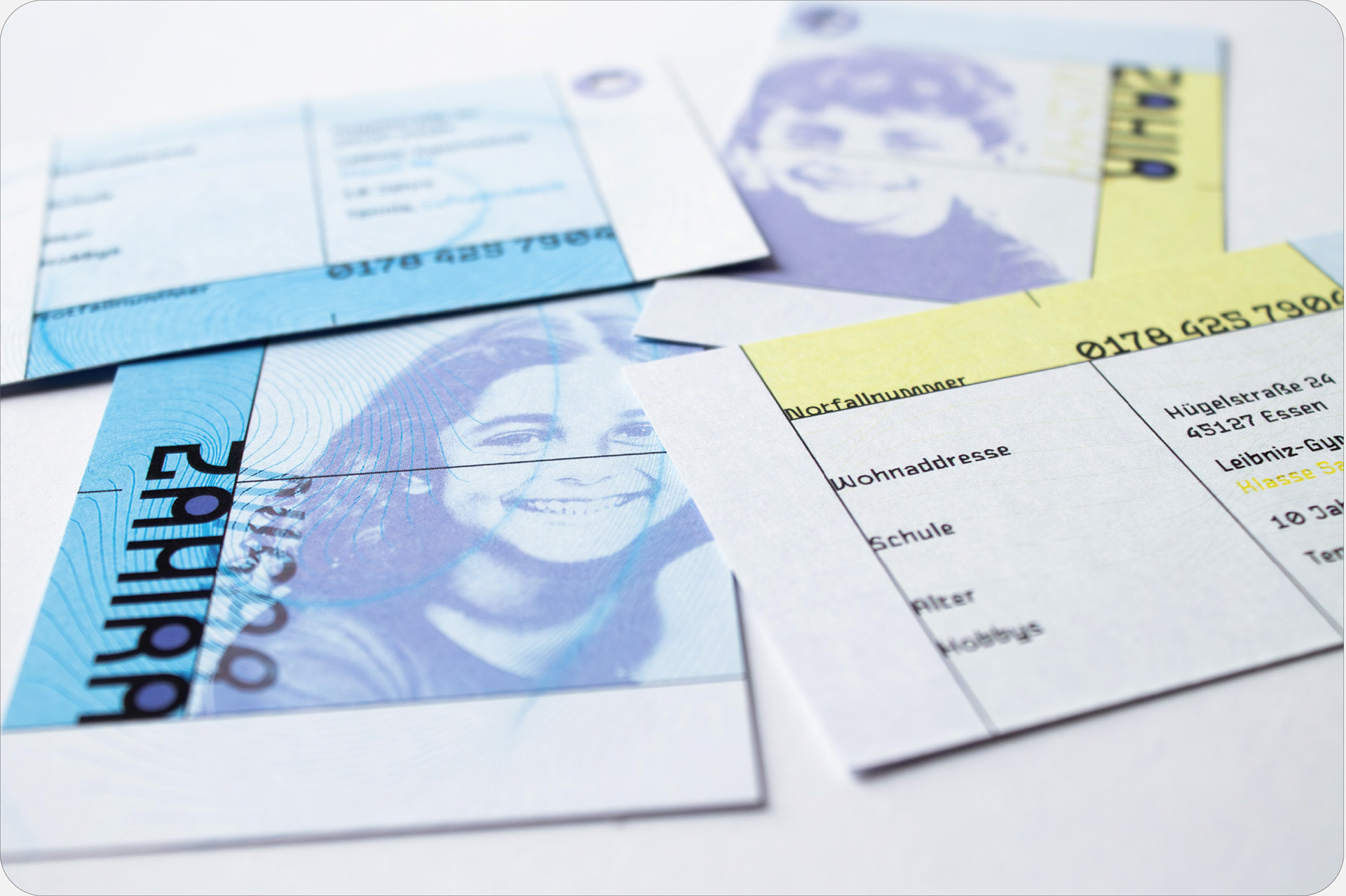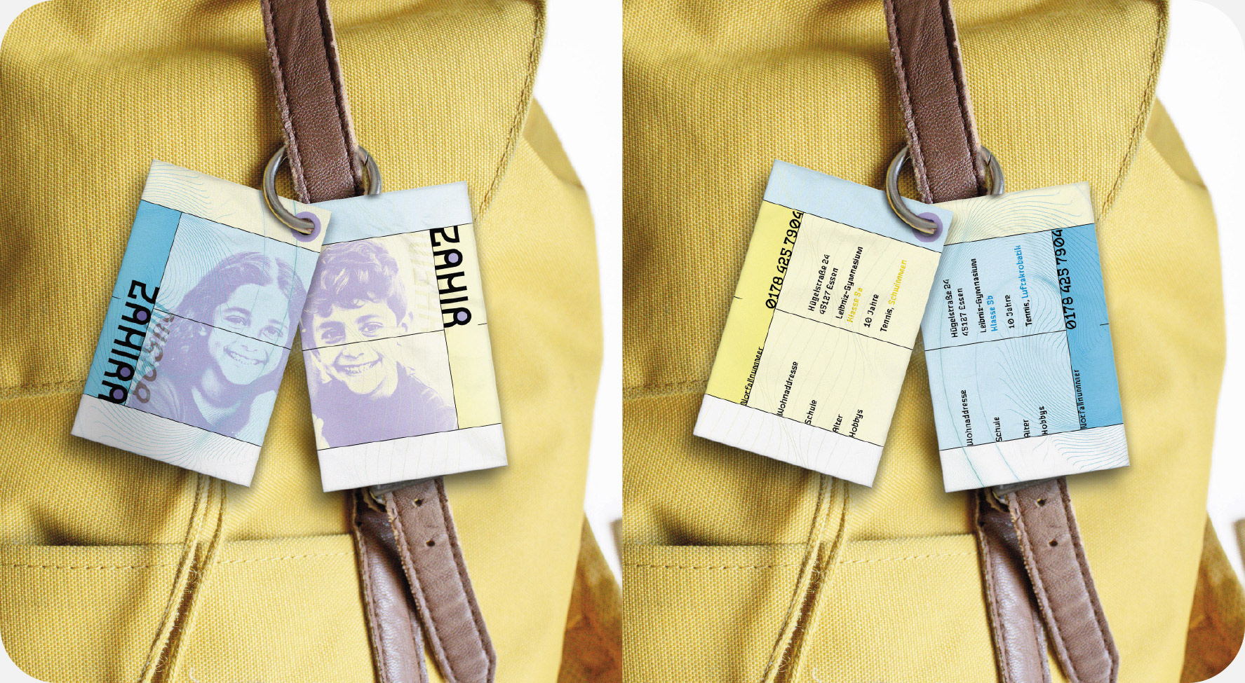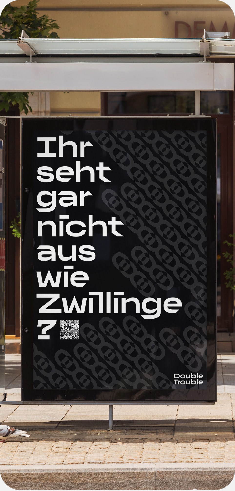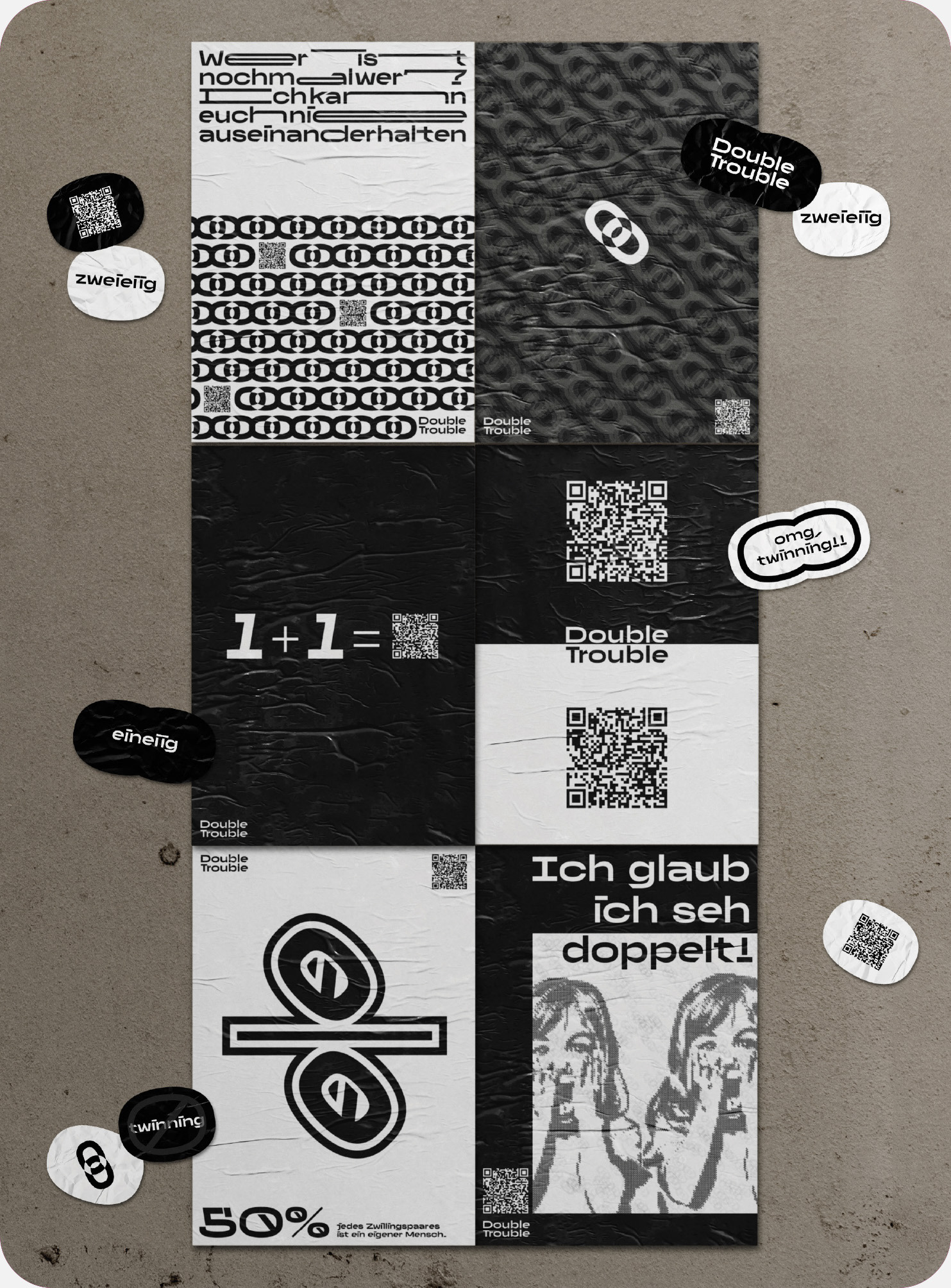 This project deals with the identity formation of twins by assigning them individual media/„corporate designs“, based on survey data. The degree of uniformity/similarity is determined and categorized into one of five levels, on which the design is based. Eleven real pairs of twins were surveyed and ultimately processed into two fictional example pairs, each getting their own designs. The underlying fictional service „Double Trouble“ was also visually explored.
