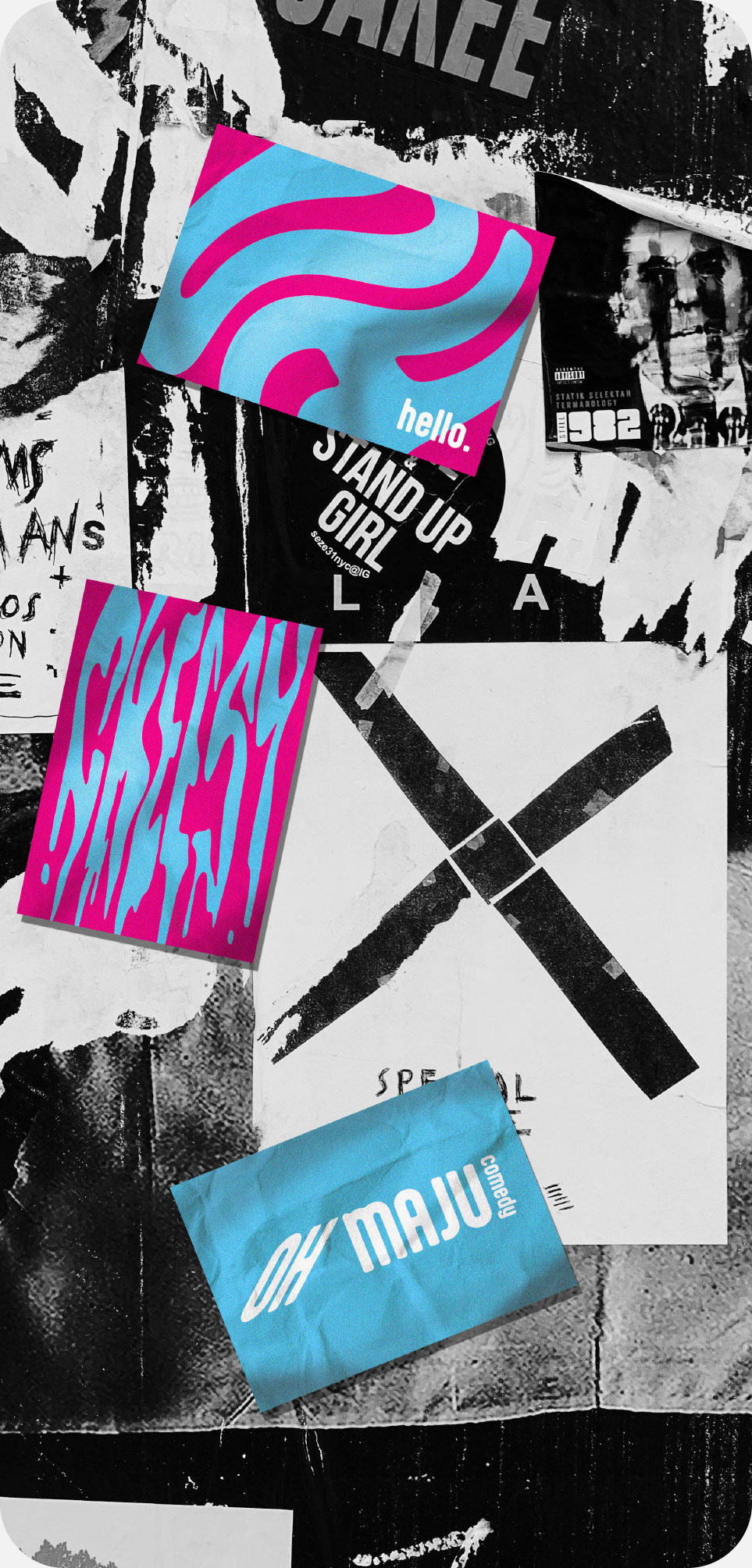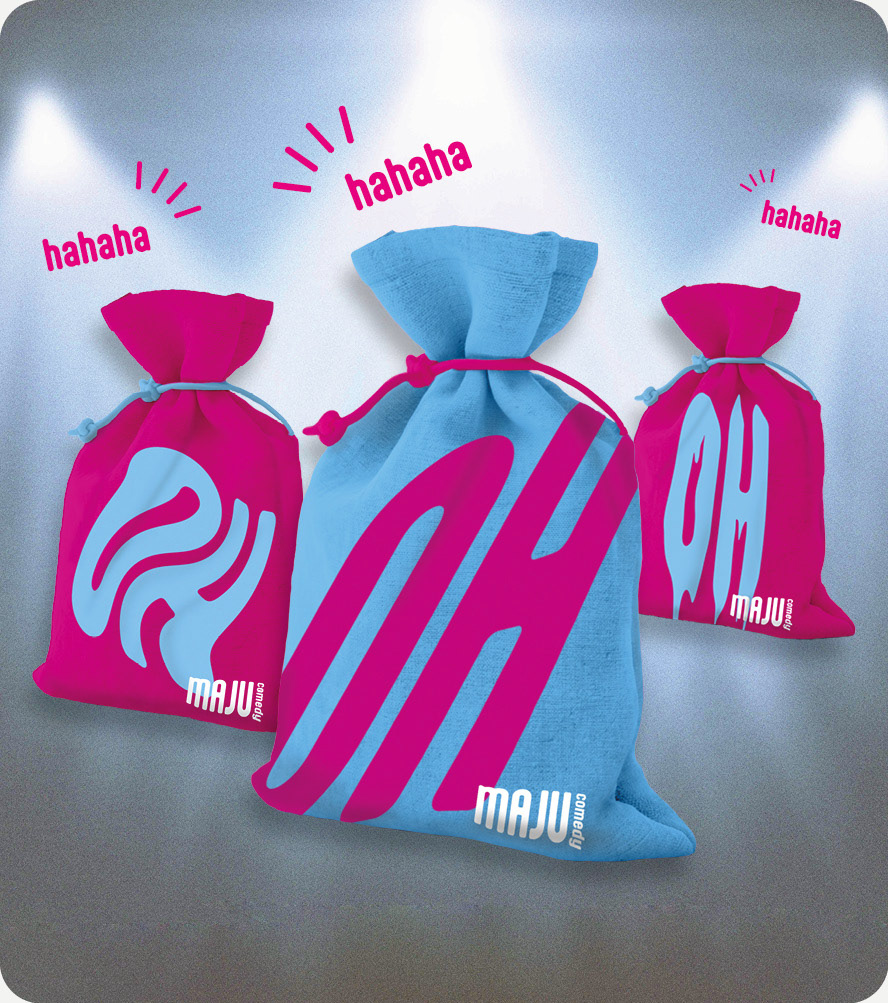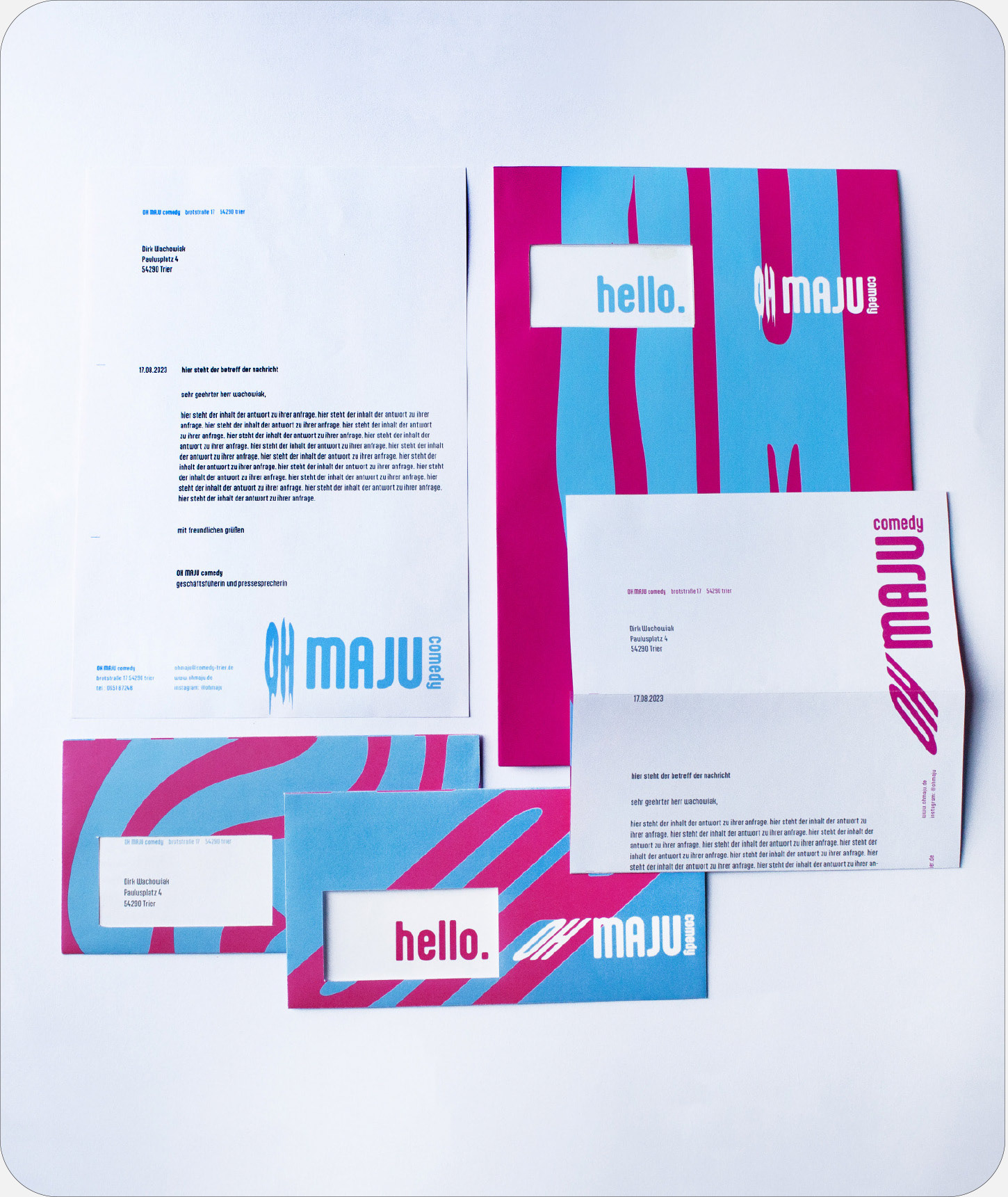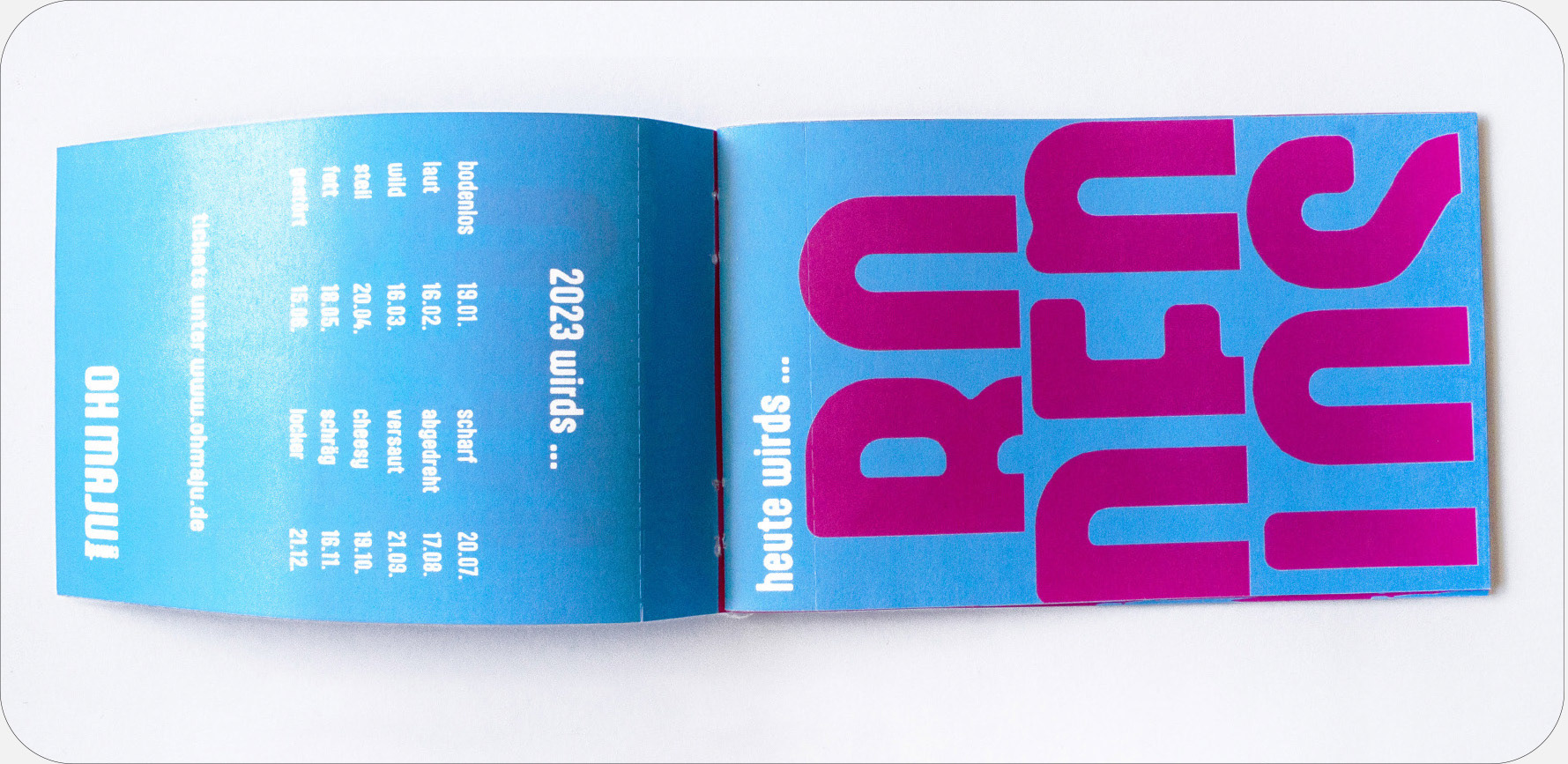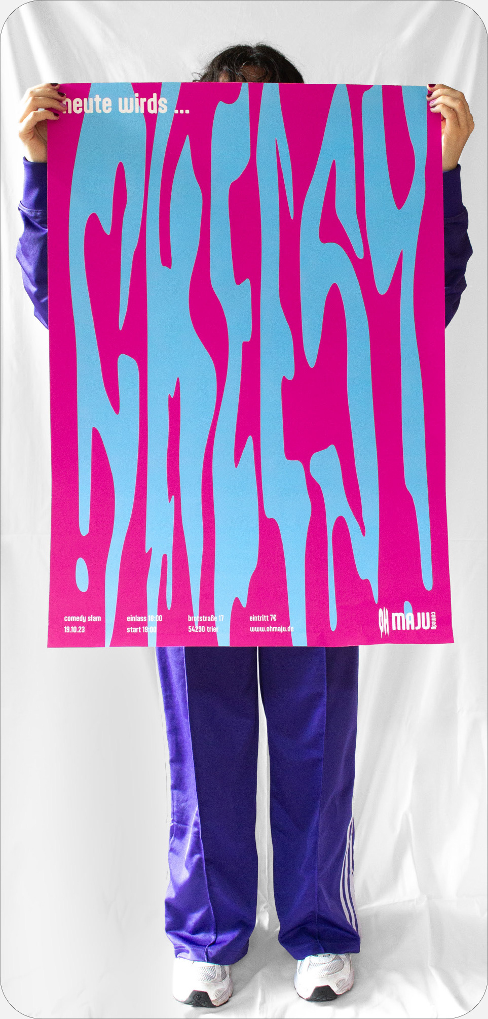 The comedy club „oh maju“ (=exclamation of surprise from the Palatinate dialect) was created in response to the confusing but large slam culture in Trier, GER. The dynamic visual identity can be adapted to the twelve upcoming slams each season. The main design elements are typographic transformations of the logo and several adjectives, which visually represent the word meanings, while simultaneously describe the vibe of each comedy show.