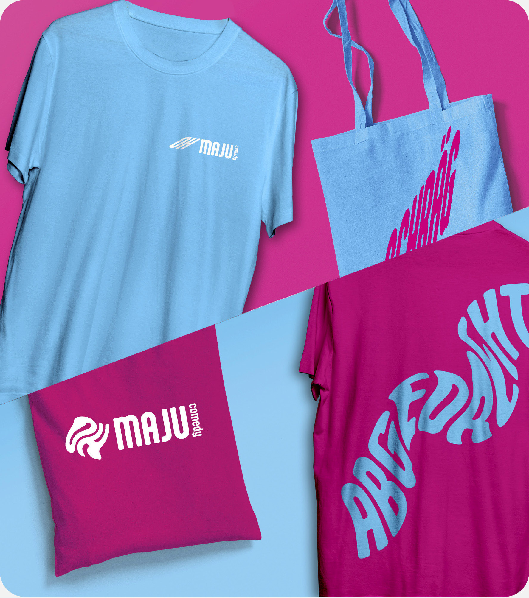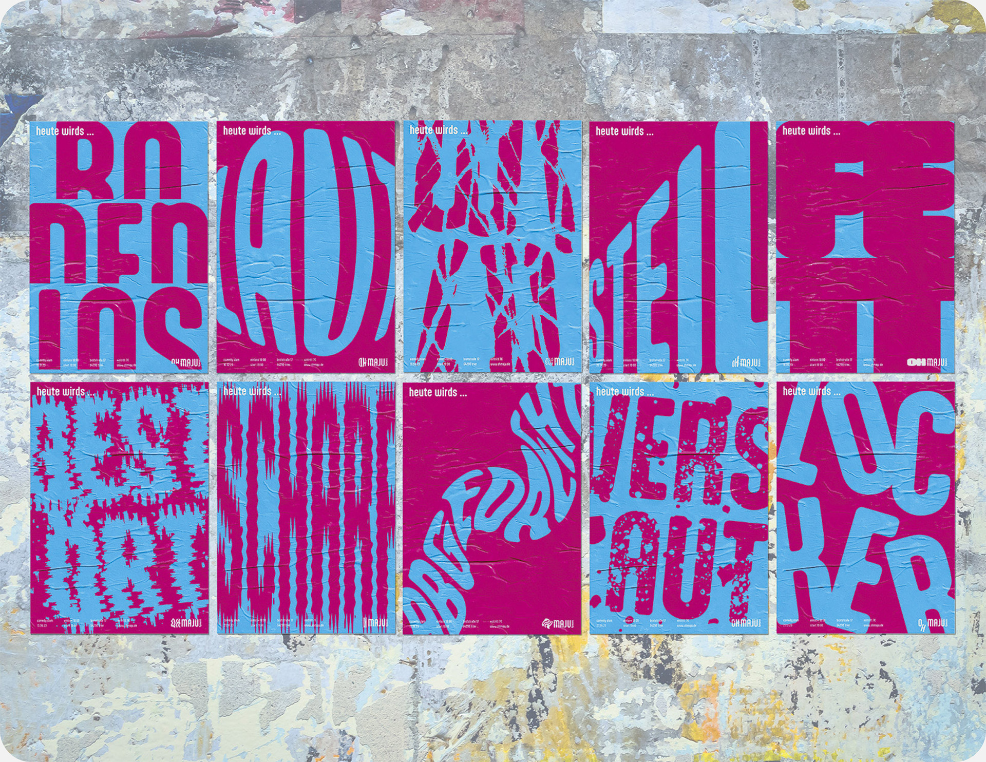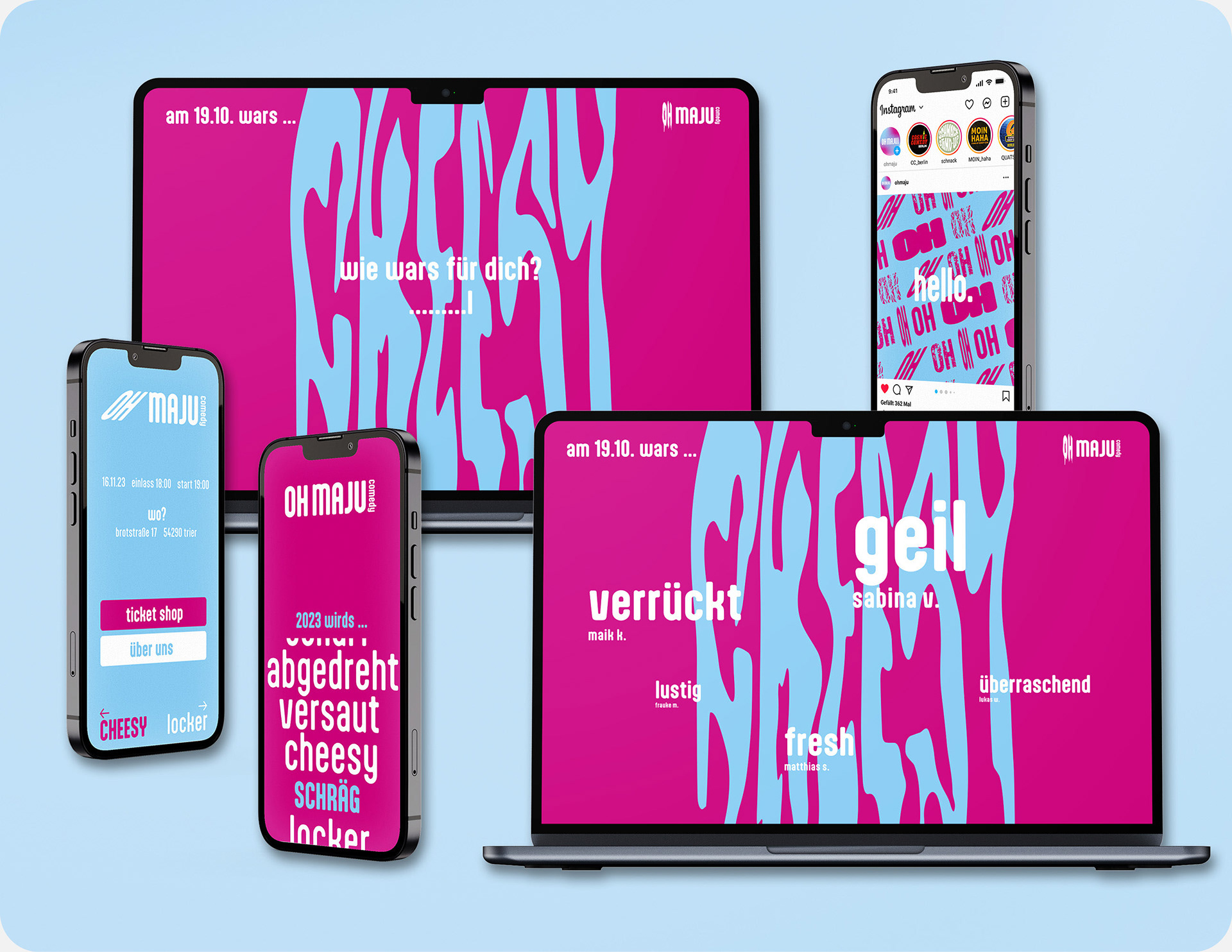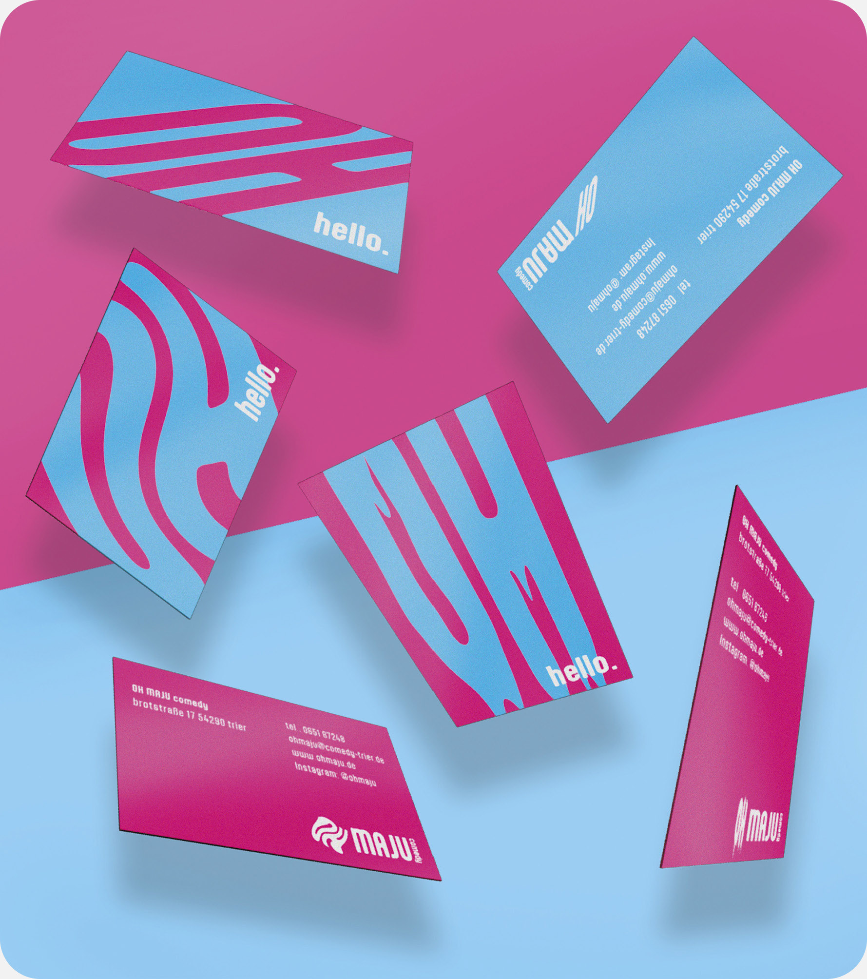 The comedy club „oh maju“ (=exclamation of surprise from the Palatinate dialect) was created in response to the confusing but large slam culture in Trier, GER. The dynamic visual identity can be adapted to the twelve upcoming slams each season. The main design elements are typographic transformations of the logo and several adjectives, which visually represent the word meanings, while simultaneously describe the vibe of each comedy show.